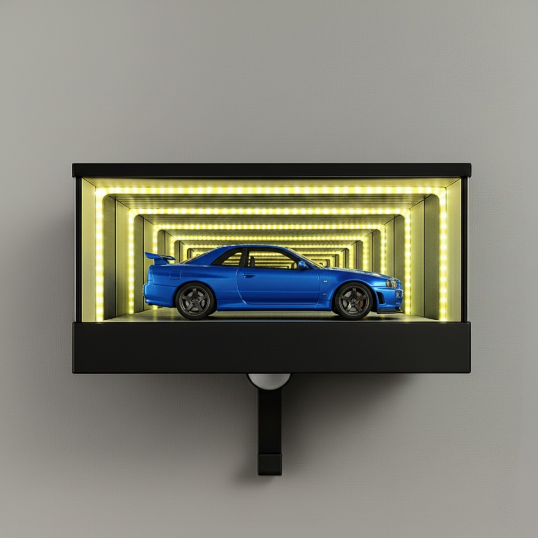 Unsere Infinty Garage ist ein absolutes Muss für jeden Sammler und Auto Enthusiasten. Das edle und simple Design passt an jede Wand und der Sensor mit Bewegungsmelder aktiviert das LED für 30 Sekunden nachdem keine Bewegung mehr erkannt wird. Ein eleganter Anblick für jeden Besucher, vor allem wenn Ihr bestes Sammlerstück die Infinty Garage beschmückt.